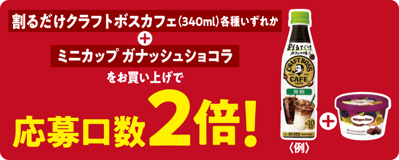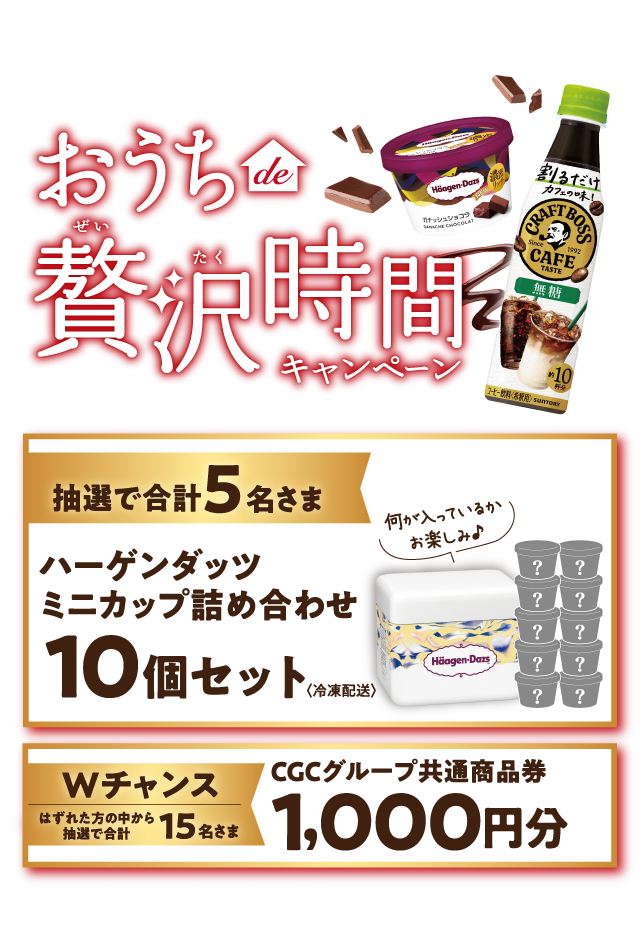 サントリー対象商品(1点以上)とハーゲンダッツ対象商品(1点以上)の両方を含む、合計1,000円(税込)以上お買い上げのレシートでご応募ください。(レシート複数枚の合算可)