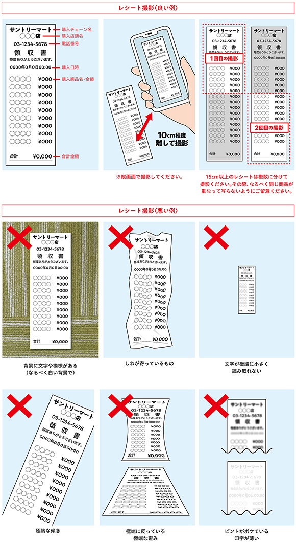 - 「購入店舗情報(店舗名・電話番号)」「購入日時」「購入商品名・金額」が鮮明に読み取れるように撮影してください。